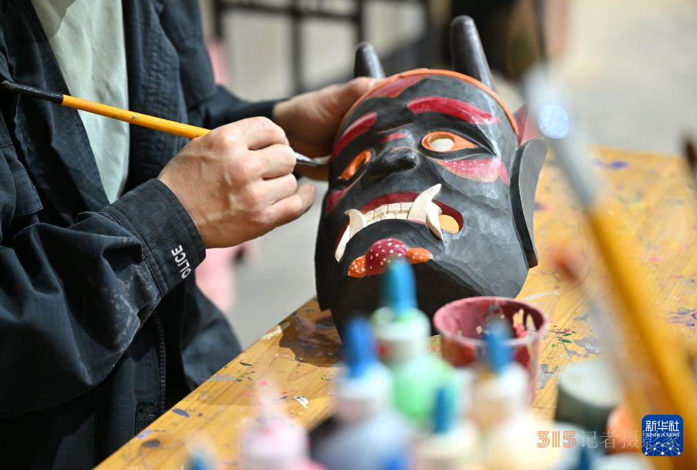 近日,湖北省恩施土家族苗族自治州傩面具制作传承人汪儒斌正忙着手工雕刻、绘制一批傩面具,为即将进行的一场傩文化研学活动作准备。